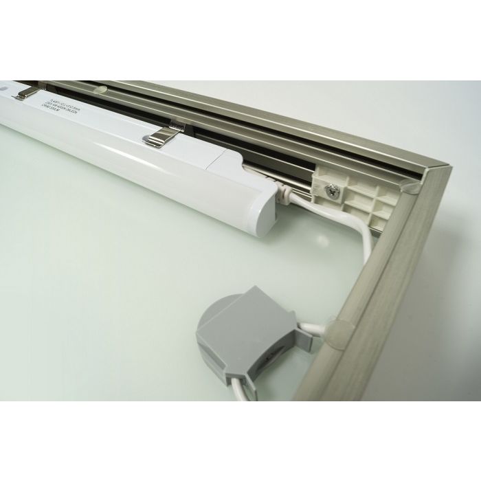 Denver Snite LED 600 mm | 600 mm | 7 W | 4000 K (Neutralweiß) | > 80 | 63–64 lm/W | ca. 400 lm | 110° | 230 V | 30.000 h | IP20 | Aluminium / Glas, Edelstahloptik | 2000 mm (mit Eurostecker) | ESG-Sicherheitsglas-Regal, Schalter linksseitig, Tragkraft 1 kg/100 mm |