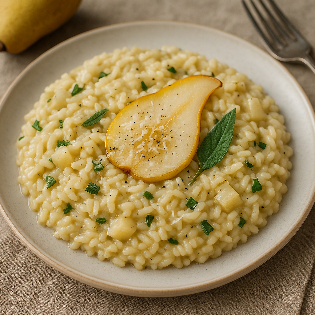 Risotto gilt als die Seele der italienischen Küche – cremig, wärmend, vielseitig. In dieser herbstlich inspirierten Variante kommt zur feinen Grundbasis aus Risottoreis und Gemüsebrühe eine fruchtige Komponente: Birne. Zusammen mit frischem Salbei und geriebenem Parmesan entsteht ein Gericht, das bodenständig und raffiniert zugleich schmeckt. Perfekt als vegetarisches Hauptgericht, das sich auch für Gäste eignet – oder als sanfter Einstieg für Kleinkinder, wenn mild gewürzt.