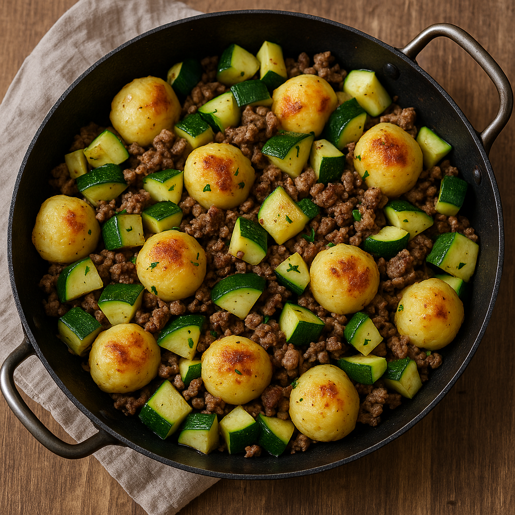 Deftige Klößchen aus Kloßteig treffen auf gebratenes Gemüse und optional würziges Hackfleisch – diese schnelle Pfanne für 4 Personen ist ideal für herbstliche Alltagsküche mit Wohlfühlfaktor.