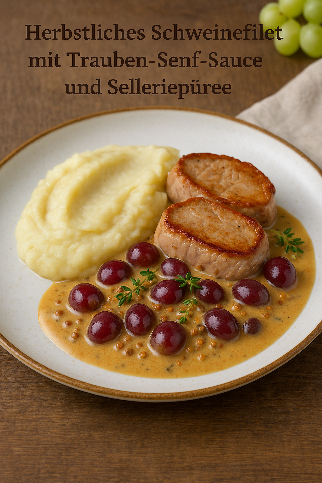 Wenn die Tage kürzer werden, Blätter unter den Schuhen rascheln und es draußen nach Herbst riecht, darf es auf dem Teller ruhig etwas wärmer und raffinierter zugehen. Dieses Gericht verbindet alles, was ein gelungenes Herbstessen ausmacht: Zartes Schweinefilet, aromatische Trauben, eine cremige Senfsauce und ein feines Selleriepüree ergeben zusammen eine ausgewogene Kombination aus Süße, Würze und wohligem Sättigungsgefühl. Ob für Gäste oder einfach für einen besonders genussvollen Familienabend – dieses Rezept ist unkompliziert, aber eindrucksvoll.