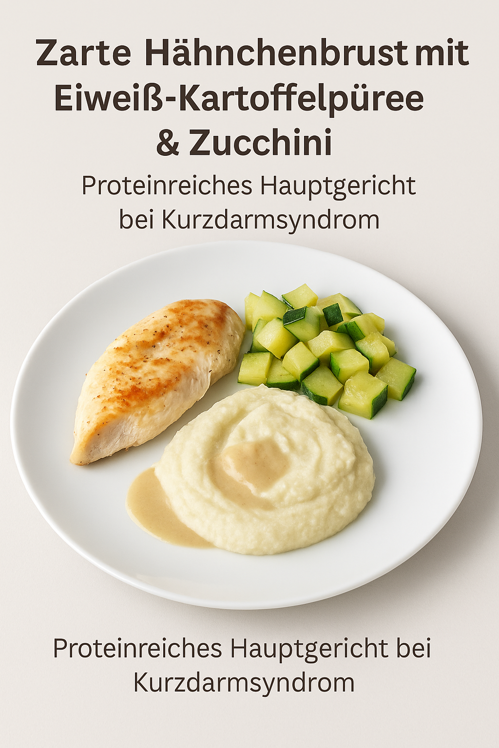 Ein leicht verdauliches, proteinreiches Gericht mit gegarter Hähnchenbrust, cremigem Eiweißpüree aus Kartoffeln und einer milden Zucchini-Beilage – ideal bei Kurzdarmsyndrom, wenn Fett- und Ballaststoffzufuhr reduziert und gut verwertbares Eiweiß gefragt ist.