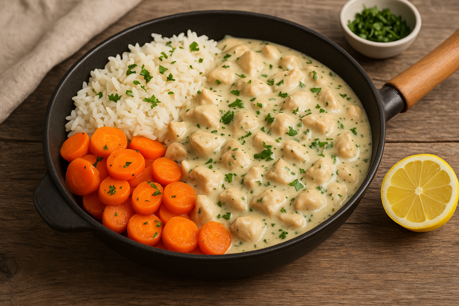 Dieses Hähnchenragout in Kräuterrahm mit Butterreis und glasierten Karotten zeigt, wie gut sich Genuss und Rücksicht vereinen lassen. Zartes Fleisch, cremige Sauce und sanft gedünstetes Gemüse sorgen für ein harmonisches Geschmackserlebnis, das leicht verdaulich, bekömmlich und liebevoll abgeschmeckt ist – ganz ohne übermäßiges Salz oder belastende Zutaten.