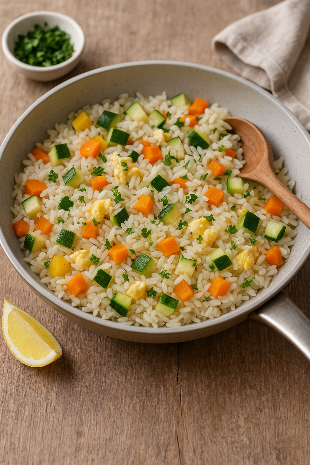 Schnell, einfach und trotzdem ausgewogen – diese Gemüse-Reispfanne mit Ei und Kräutern ist ideal für alle, die sich nierenfreundlich und leicht ernähren möchten, ohne auf Geschmack zu verzichten. Das Gericht bringt frisches Gemüse, mild gewürzten Reis und hochwertiges Eiweiß zusammen – perfekt für eine warme Mahlzeit, die sich auch bei Niereninsuffizienz oder nach einer Operation gut verträgt.