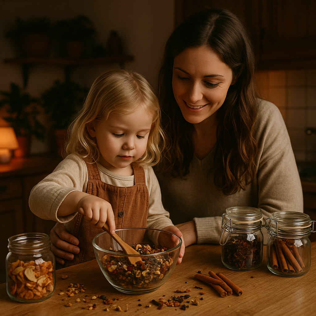 Das Teemischen ist eine wunderschöne Beschäftigung für Kinder – sicher, kreativ und voller Sinneserlebnisse. Ein ideales Familienritual für gemütliche Nachmittage im Herbst.
