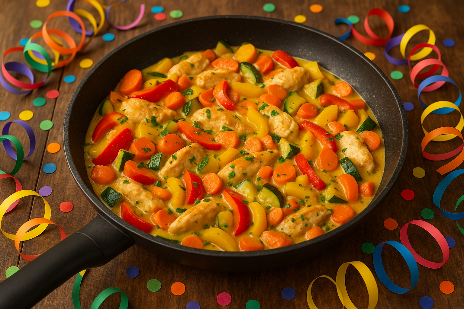 Ein farbenfrohes Pfannengericht voller Geschmack und Lebensfreude: zarte Hähnchenstreifen, knackiges Gemüse und eine cremige Kräuterrahmsauce ergeben eine Mahlzeit, die Groß und Klein begeistert – perfekt für Fasching, Kindergeburtstag oder einfach einen fröhlichen Winterabend.