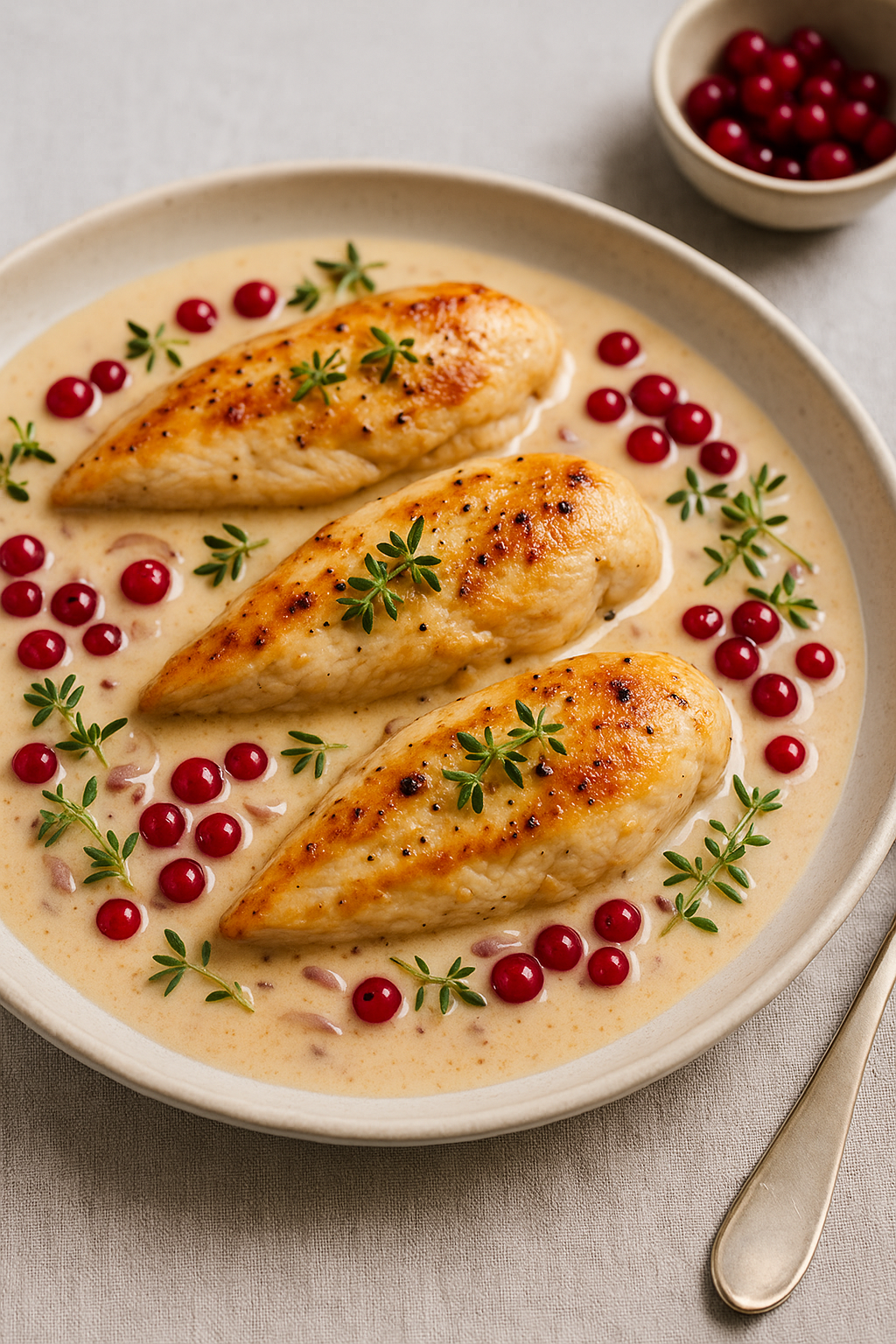 Zarte Hähnchenbrust filetiert in einer cremig-fruchtigen Schlehengeist-Sauce, verfeinert mit Thymian, Schalotten und einem Hauch Preiselbeeren. Ein herbstlich-winterliches Wohlfühlgericht mit feiner Spirituosennote.