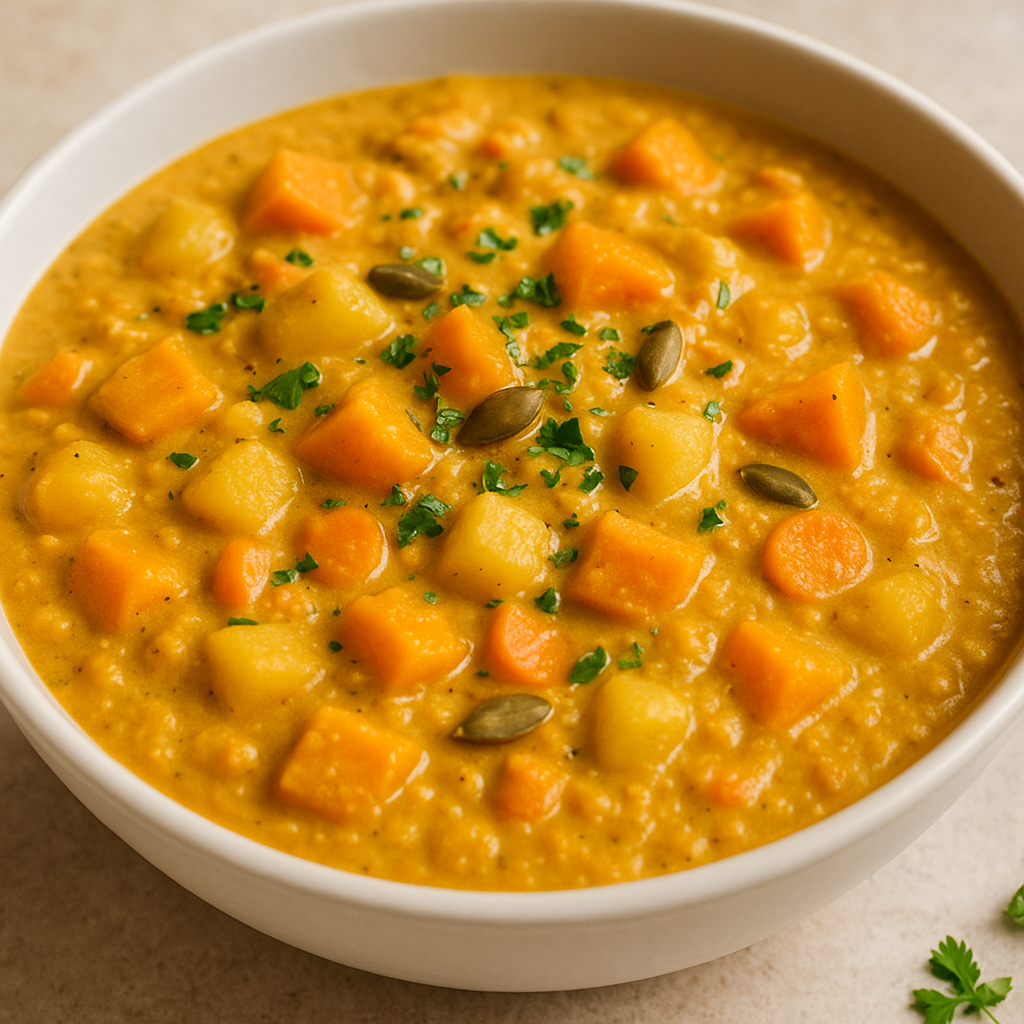 Ein wunderbar cremiger und zugleich stückiger Kürbiseintopf mit Kartoffeln, Karotten und milden Gewürzen – sättigend, aromatisch und ideal für Herbst & Winter.
