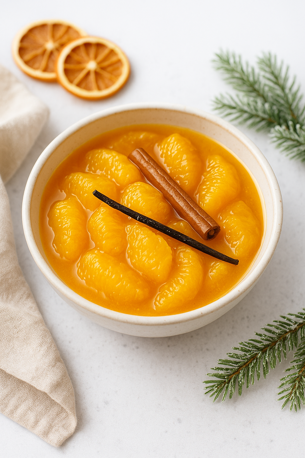 Ein sanft eingekochtes Kompott aus frischen Orangen, Vanille und einem Hauch Zimt. Fruchtig, aromatisch und vielseitig einsetzbar – perfekt für Wintertage, Desserts oder als Topping für Joghurt, Waffeln und Kuchen.