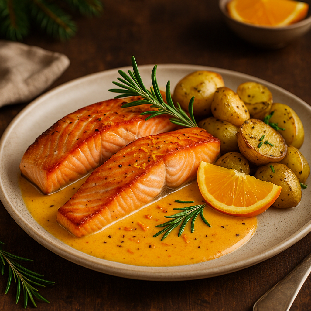 Zartes Lachsfilet wird in einer cremigen, aromatisch-herben Sauce aus Gin, Wacholder und Sahne geschmort. Dazu glasiert-süße Möhren und knusprige Rosmarinkartoffeln – ein edles, aber unkompliziertes Festtagsgericht.