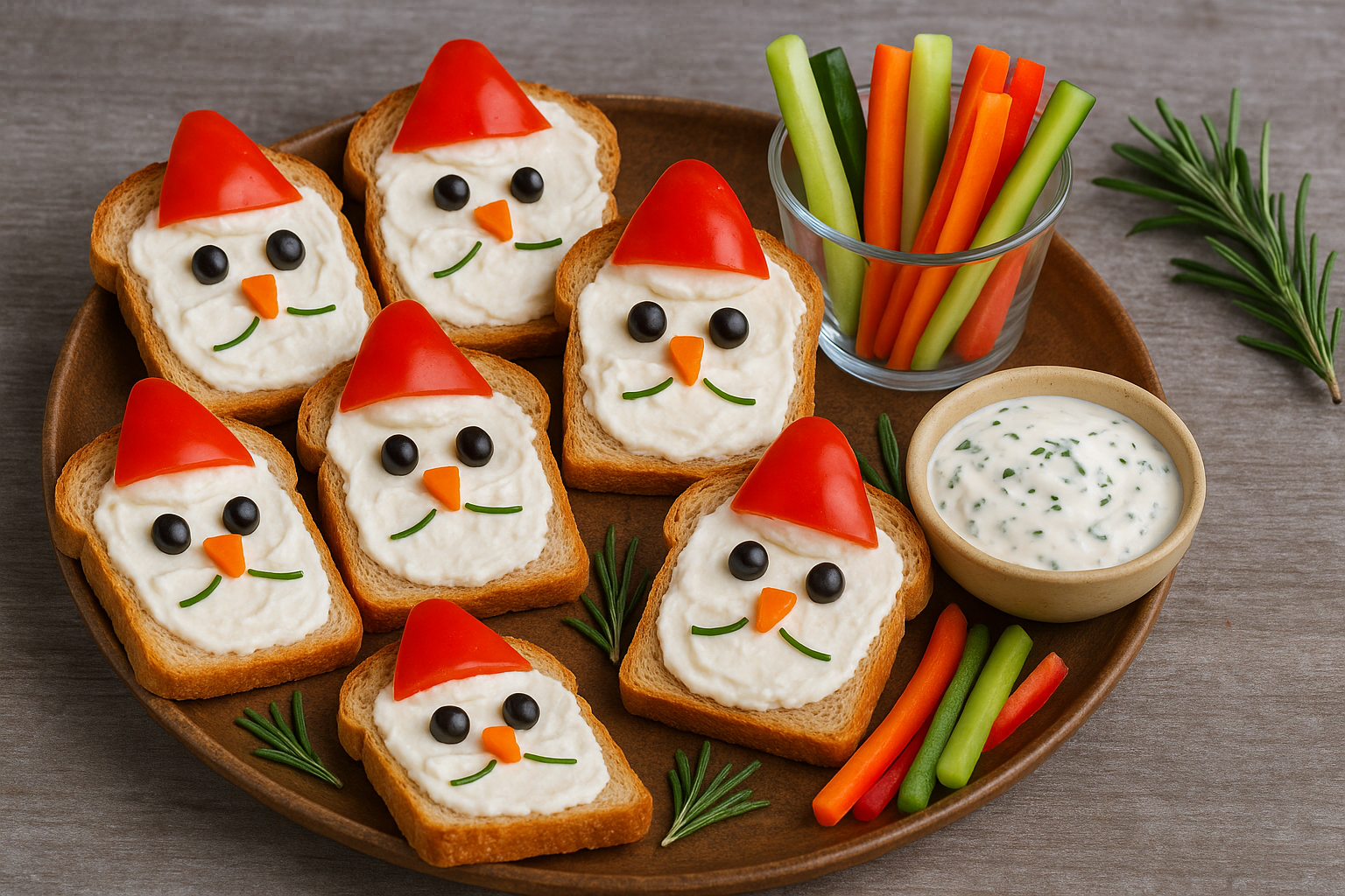 Herzhafte Nikolaus-Wichtelbrote mit Frischkäse, Paprika-Mützen und Olivenaugen, dazu bunte Winter-Gemüsesticks und ein milder Kräuterdip – eine schnelle, kreative und kinderfreundliche Nikolaus-Brotzeit für den Abend.