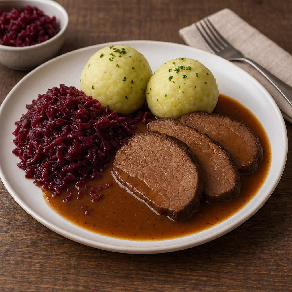 Ein typisch hessisches Festtagsgericht: zarter, mehrere Tage eingelegter Sauerbraten in aromatischer Soße, dazu grüne Klöße nach Art der Region und fruchtiger Apfelrotkohl. Traditionell, wärmend und perfekt für große Familienrunden.