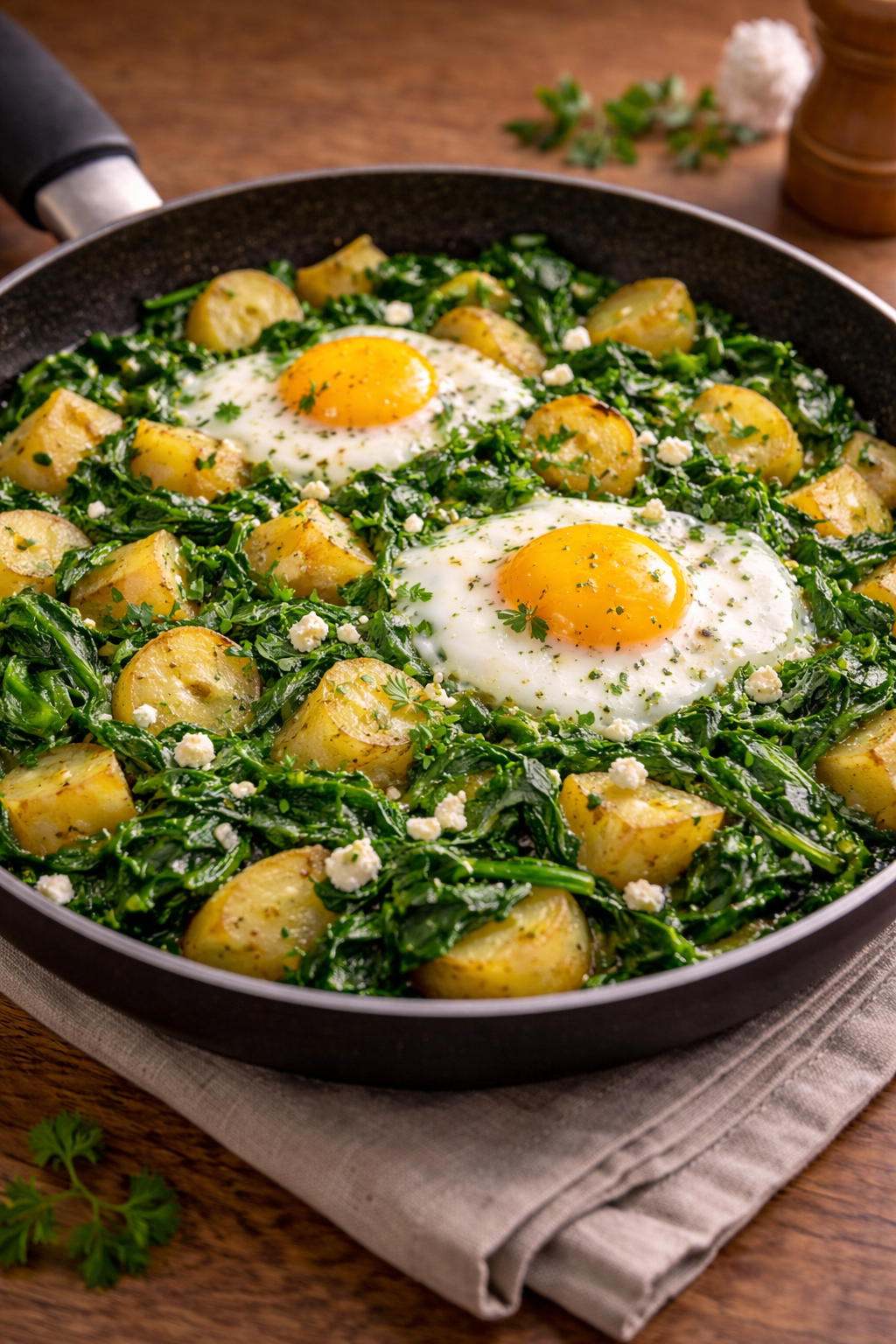 Diese Spinat-Kartoffel-Pfanne ist ein schnelles, wärmendes Wintergericht. Sie liefert Energie, Vitamine und ist mit wenigen Zutaten in nur 15 Minuten servierfertig.