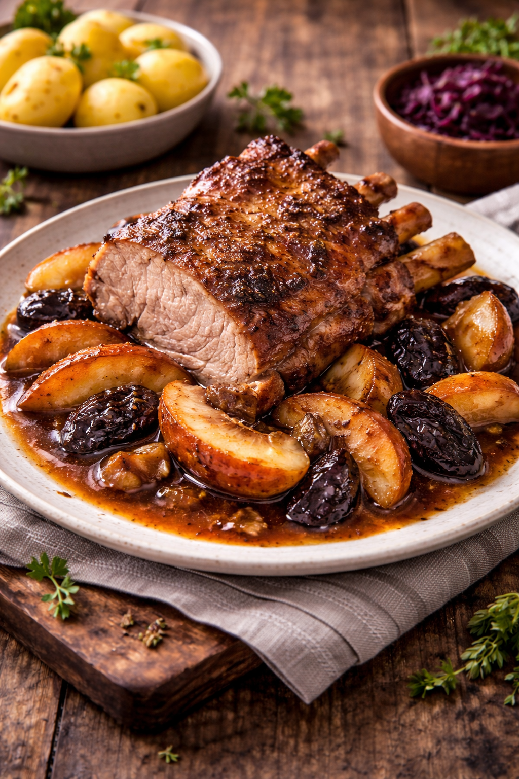 Saftig geschmorter Schweinerippenbraten mit Pflaumen und Äpfeln – ein traditionelles Fest- und Sonntagsgericht aus Mecklenburg-Vorpommern, das süsse und herzhafte Aromen auf klassische Weise verbindet.