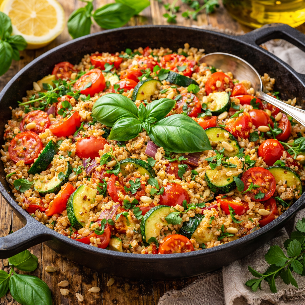 Hirse ist ein unterschätztes Superkorn: glutenfrei, mineralstoffreich und wunderbar aromatisch. In Kombination mit sonnengereiften Tomaten und mediterranen Kräutern entsteht ein vollwertiges Gericht, das durch natürliche Zutaten überzeugt.