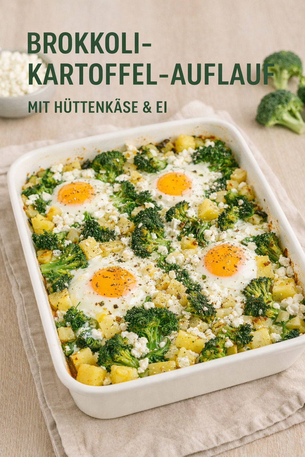 Dieser herzhafte Auflauf kombiniert dampfgegarten Brokkoli, Kartoffeln, Hüttenkäse und Ei zu einer vollwertigen Mahlzeit. Reich an Proteinen, Mineralstoffen und gut verdaulicher Energie – perfekt für schwache oder rekonvaleszente Personen mit erhöhtem Nährstoffbedarf.