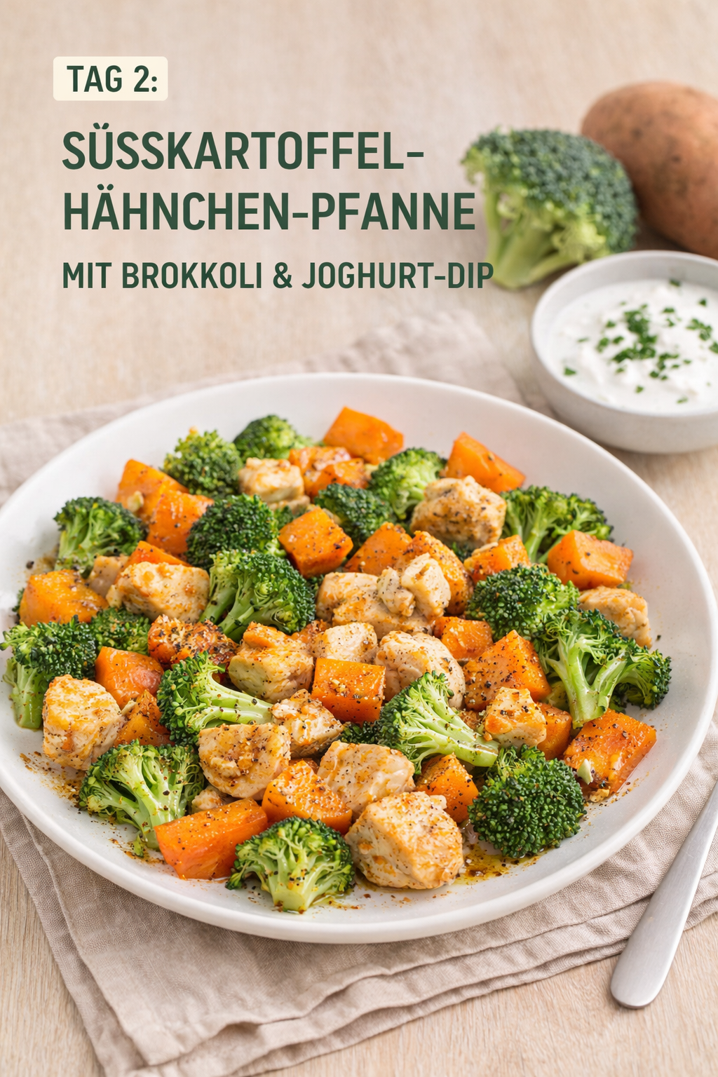 Im zweiten Trimester – und auch darüber hinaus – steigt der Bedarf an Energie und Nährstoffen deutlich an. Gleichzeitig sollte das Essen nicht schwer im Magen liegen. Diese Süßkartoffel-Hähnchen-Pfanne vereint alles, was du brauchst: hochwertiges Eiweiß für den Zellaufbau, komplexe Kohlenhydrate für langanhaltende Energie und wichtige Vitamine für die Entwicklung deines Babys. Der frische Joghurt-Dip sorgt zusätzlich für eine angenehme Frische und unterstützt die Verdauung.