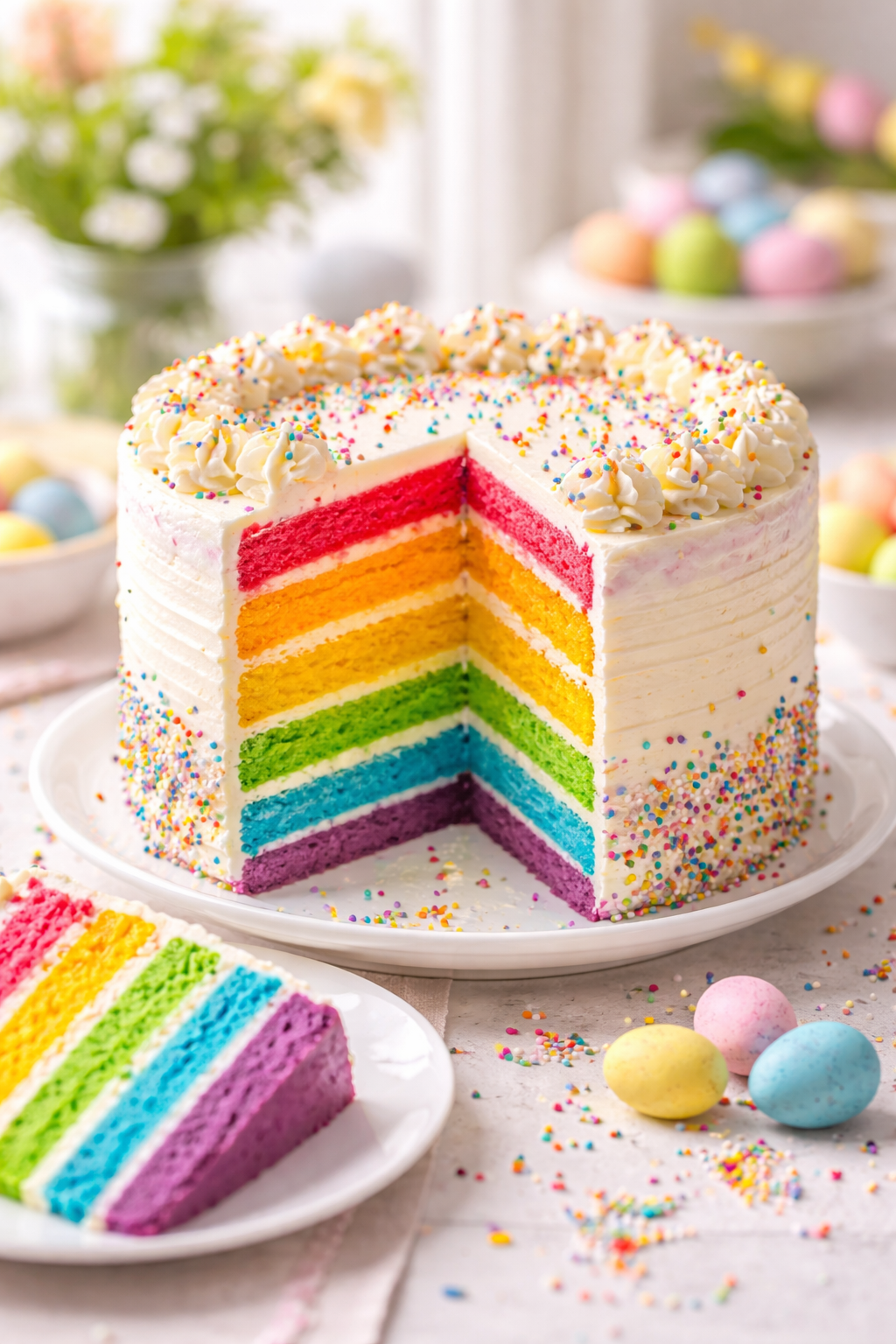 Diese Regenbogentorte ist ein echter Hingucker und sorgt garantiert für Begeisterung – besonders bei Kindern. Mit ihren farbenfrohen Schichten bringt sie Freude auf jeden Tisch und eignet sich perfekt für Geburtstage, Ostern oder einfach als Highlight für die Familie.