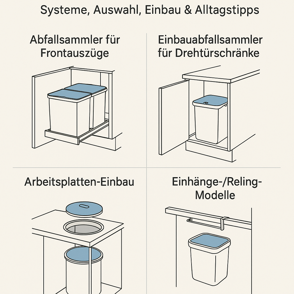 Hinweis / Verweis: Ergänzend empfehlen wir Dir unsere Shop-Rubrik „Stauraum, Ordnungssysteme, Abfallsammler, Mülleimer“ im Magazin Deine Traumküche – dort findest Du die genannten Varianten (u. a. Einbauabfallsammler, Frontauszug, Arbeitsplatten-Einbau, Einhänge-Abfallbehälter) sowie passende Ersatzteile und Zubehör.