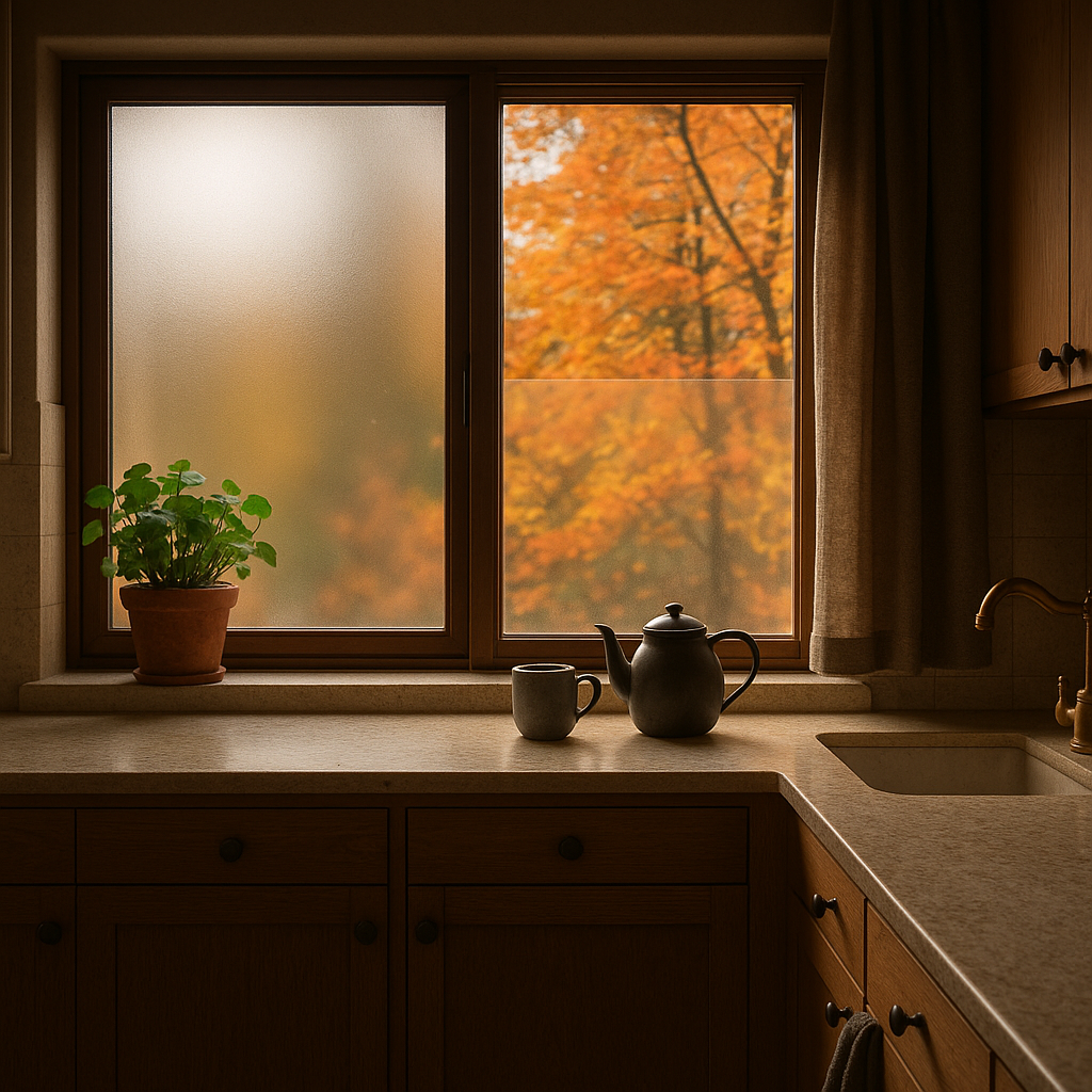 Milchglasfolien sind dabei oft die beste Balance zwischen Helligkeit und Privatsphäre – sie lassen das sanfte Herbstlicht herein, ohne den Raum zu verschatten.