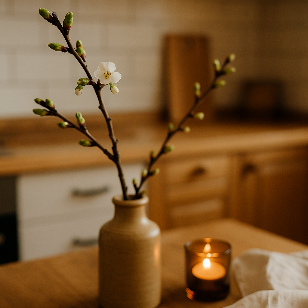 Die Küche spielt eine zentrale Rolle, weil sie der Ort der Verwandlung ist. Hier wird roher Teig zu duftenden Plätzchen, hier wird kaltes Wasser zu heißem Tee, hier wird ein kahler Zweig zu einem kleinen Baum voller Blüten. In vielen Familien ist die Küche der Ort, an dem man den Zweig täglich beobachtet, vielleicht sogar dokumentiert, wie er sich verändert. Kinder lieben diese „Natur im Haus“ – für sie ist das Erblühen ein echtes Wunder. Erwachsene sehen darin oft eine beruhigende Metapher für Geduld, Wachstum und Hoffnung.