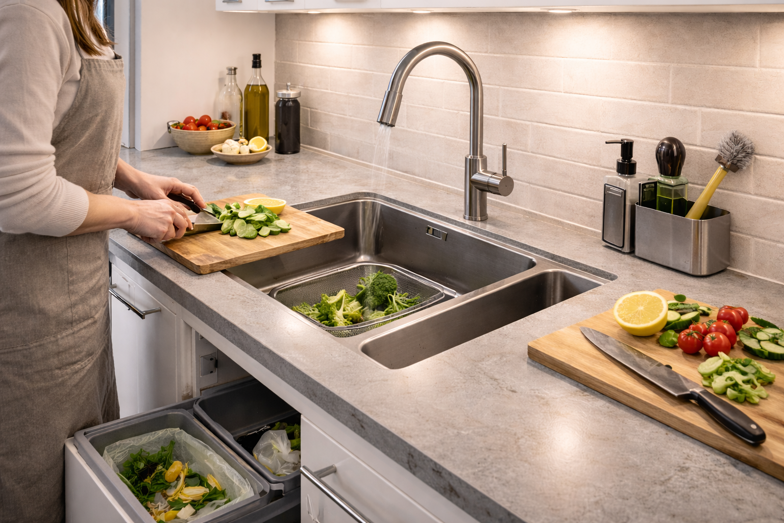 Viele Handgriffe wiederholen sich täglich. Eine gut geplante Spüle unterstützt diese Abläufe, statt sie zu unterbrechen. Besonders hilfreich ist es, Abfalltrennung, Reinigungsutensilien und Spülzubehör direkt im Spülbereich unterzubringen. Das spart Zeit und hält die Arbeitsfläche frei.