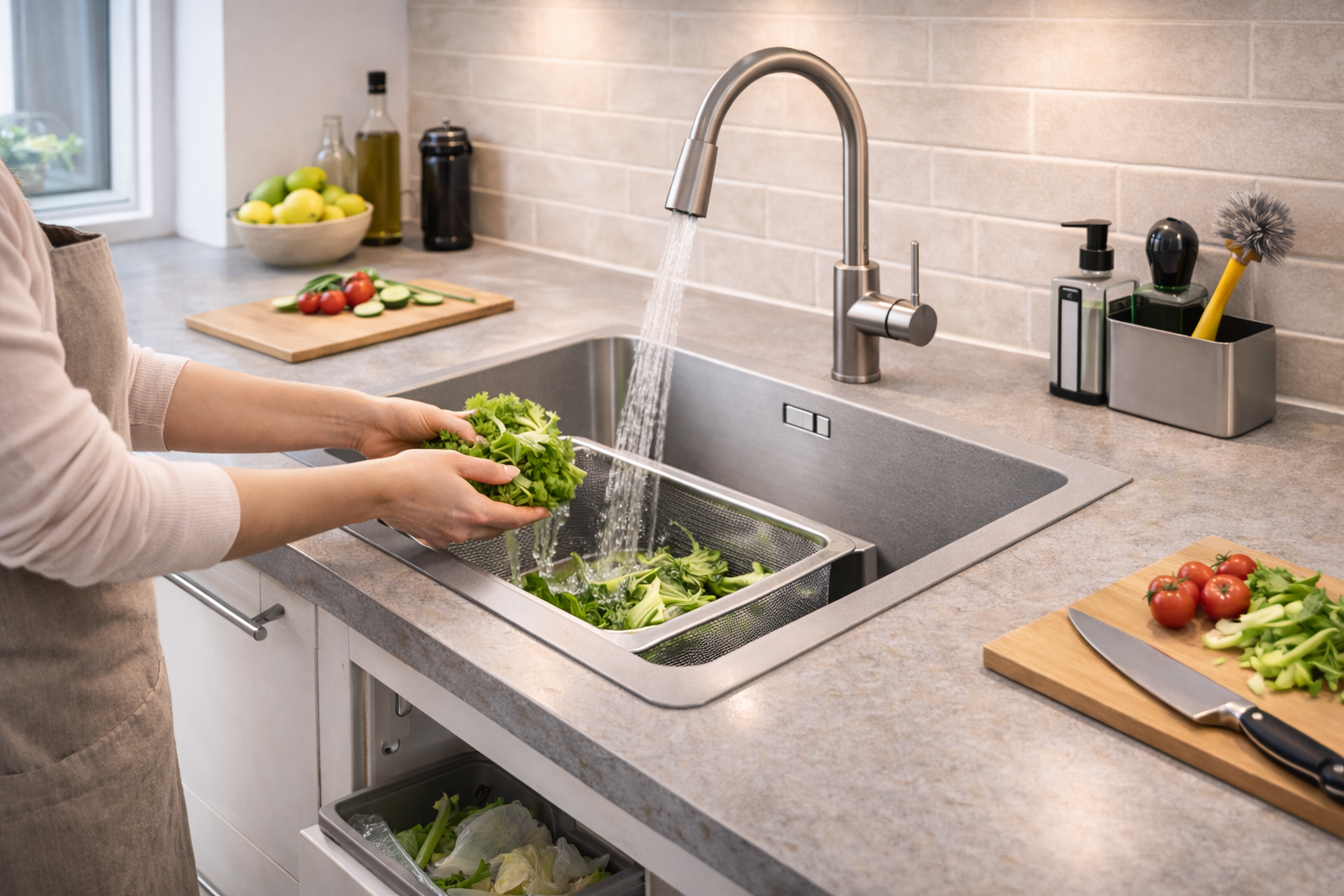 Die Spüle ist selten ein isolierter Punkt. Sie ist Teil eines Arbeitsflusses: Waschen, Schneiden, Abgießen, Entsorgen. Eine gute Spüle unterstützt diese Abläufe durch: