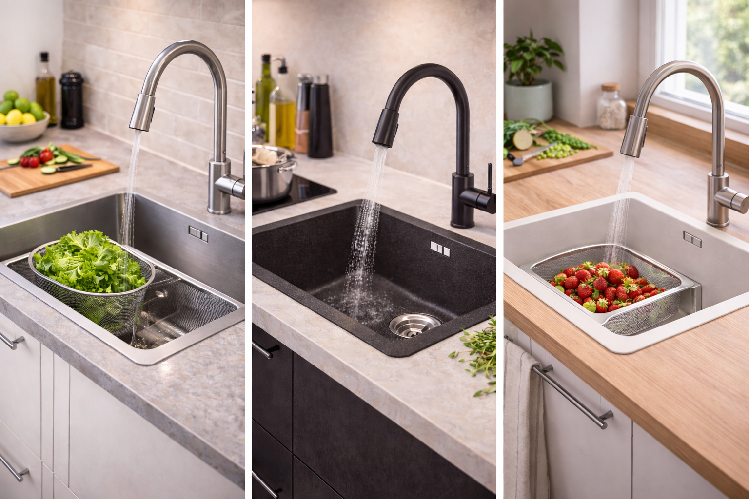 Spülen aus Verbundmaterial verbinden Eigenschaften beider Welten. Sie sind leiser als Edelstahl, flexibler im Design als Granit und pflegeleicht im Alltag. Ihre Stärke liegt in der Balance: Sie drängen sich weder funktional noch optisch in den Vordergrund, sondern passen sich verschiedenen Küchentypen gut an.