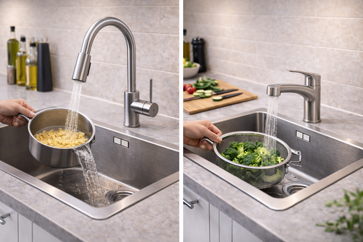 Die richtige Höhe beeinflusst auch die Körperhaltung. Wer sich regelmäßig mit großen Töpfen unter einer zu niedrigen Armatur „hindurchzwängen“ muss, arbeitet langfristig unbequemer. Umgekehrt sollte eine sehr hohe Armatur nicht dazu führen, dass man ständig nach oben greifen oder sich strecken muss.