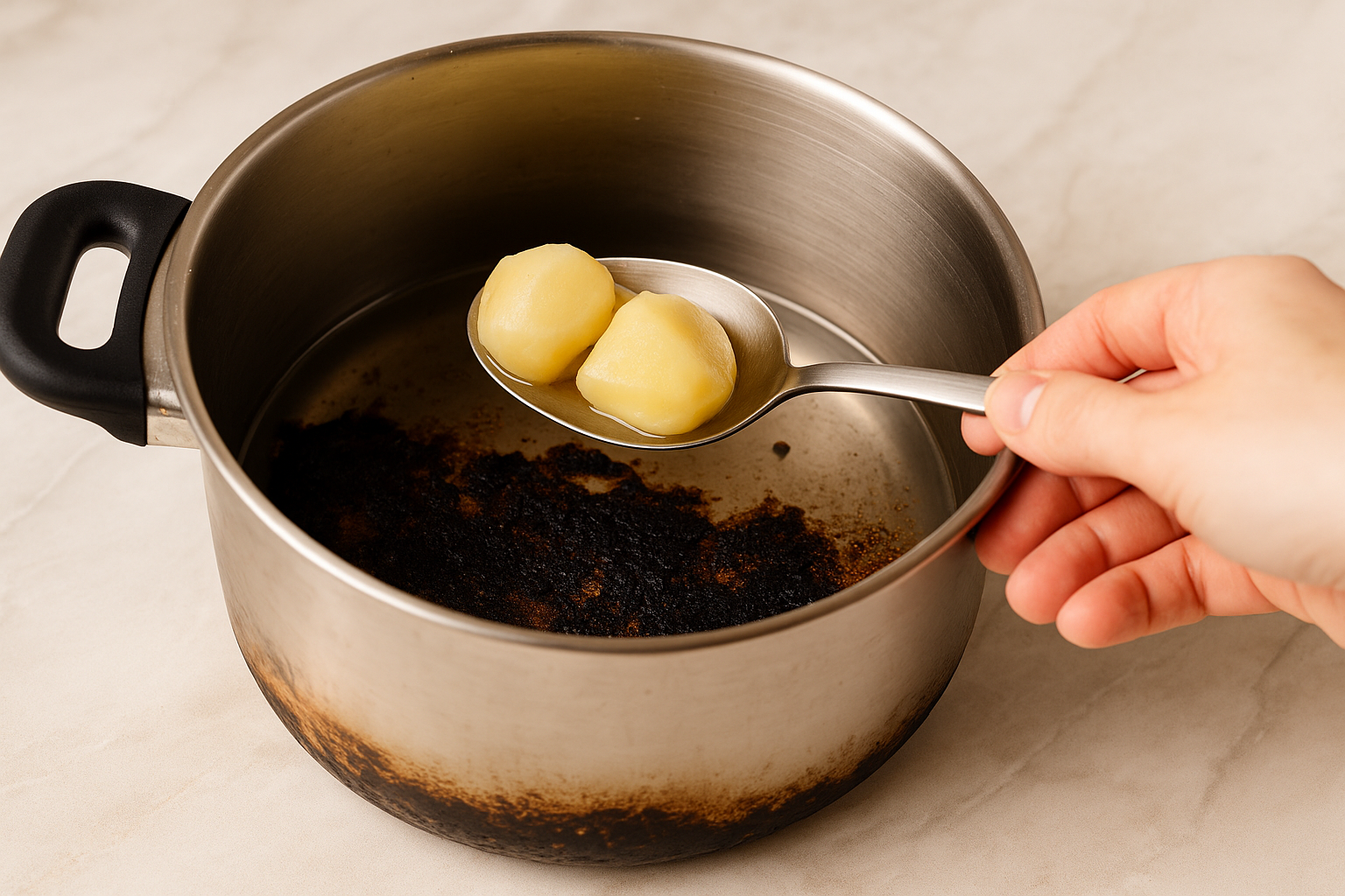 Verbranntes vollständig entfernen, Kartoffeln umfüllen, Aroma balancieren – und schon schmeckt alles wieder wie es soll.
