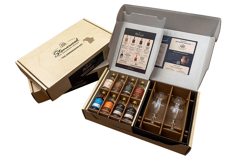 Das Stonewood Ambassador Set ist ein hochwertiges Tasting-Set für volljährige Genießer, die verschiedene Produkte aus der Stonewood Brennerei in kompakter Form kennenlernen möchten. Das Set kombiniert mehrere Miniaturen, originale Whiskygläser sowie begleitendes Infomaterial in einem abgestimmten Gesamtpaket.