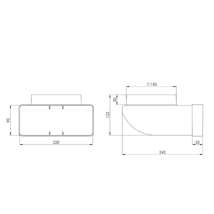 Der Übergang erfolgt von Flachkanal Ø 150 mm auf Rundanschluss Ø 150 mm und erlaubt eine saubere Anpassung an unterschiedliche Abluftsysteme. Durch die 90°-Umlenkung lassen sich auch enge Einbausituationen problemlos realisieren.