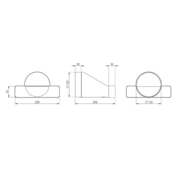 Mit den Abmessungen L 200 × B 220 × H 55 mm lässt sich das Übergangsstück problemlos in bestehende Abluftführungen integrieren und ist optimal auf Ø-125-mm-Systeme abgestimmt.