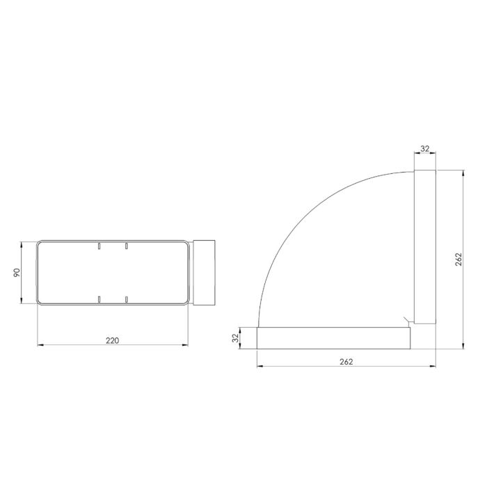 Mit den Abmessungen L 262 × B 220 × H 90 mm und dem Systemmaß Ø 150 mm ist der Bogen optimal auf gängige Flachkanalsysteme abgestimmt und lässt sich problemlos in bestehende Abluftführungen integrieren.