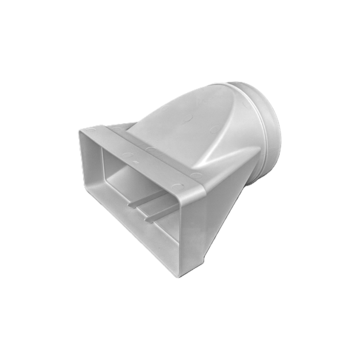 Gefertigt aus weißem Kunststoff, ist das Übergangsstück leicht, formstabil und korrosionsbeständig. Die kompakte Bauform sorgt für eine platzsparende Installation und unterstützt einen gleichmäßigen Luftstrom.