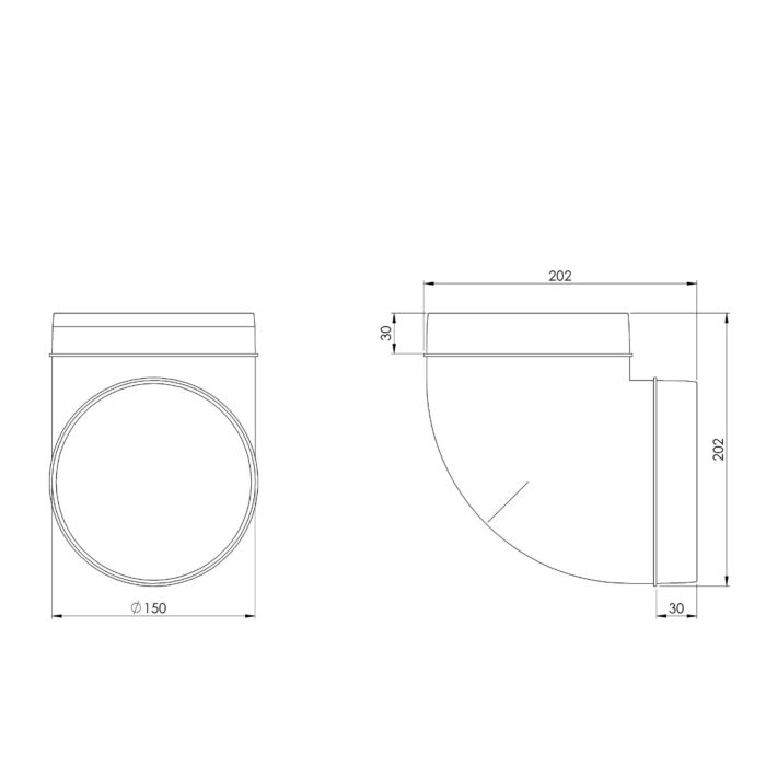 Mit seinen Abmessungen L 202 × B 150 × H 150 mm ist der Bogen optimal auf gängige Ø-150-mm-Rundrohrsysteme abgestimmt und ermöglicht eine platzsparende Umlenkung der Abluft in der Küche oder im Lüftungssystem.