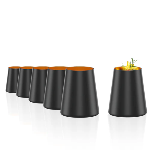 Edle Becher aus Kristallglas in Schwarz-Gold. Ideal für Cocktails, Wasser und Säfte – langlebig, modern und spülmaschinengeeignet.