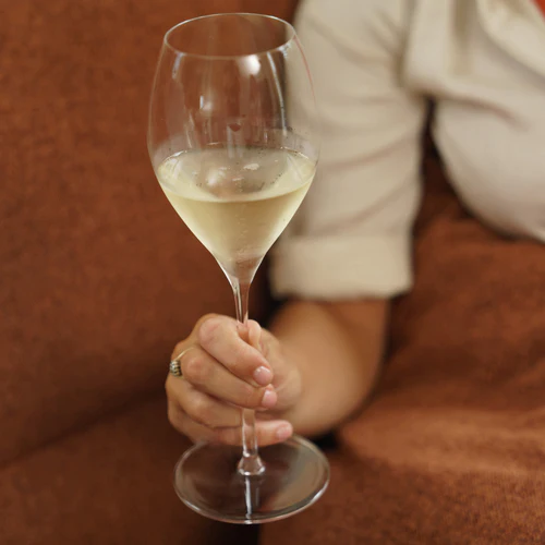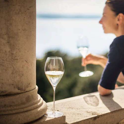 Die schlanke, harmonisch proportionierte Kelchform unterstützt eine langanhaltende Perlage und sorgt gleichzeitig für optimale Belüftung. So können sich Frische, feine Säurestruktur und komplexe Aromen ideal entfalten.