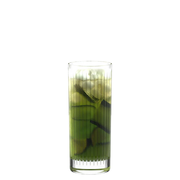 Mit einem Gewicht von 315 g und einem massiven Glasboden bietet der Becher eine ausgezeichnete Standfestigkeit und eine besonders wertige, ausbalancierte Haptik. Das Volumen von 405 ml bietet ausreichend Platz für Eiswürfel, Garnituren und perfekt abgestimmte Longdrinks.