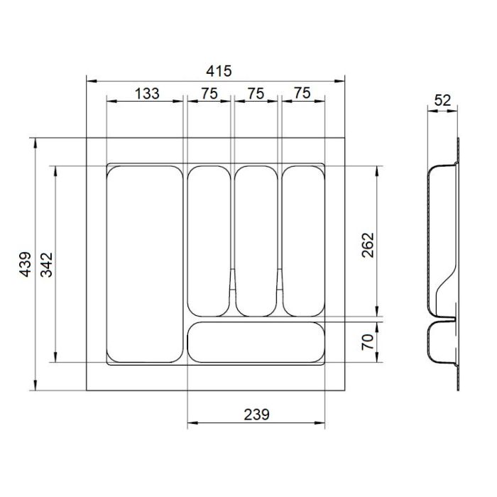 Dank der Maße B 415 × T 439 × H 52 mm eignet sich der Einsatz perfekt für viele Küchenschubladen mit größerer Tiefe und bietet großzügigen Stauraum bei gleichzeitig kompaktem Aufbau. Das robuste HIPS-Material ist schlagfest, pflegeleicht und ideal für den täglichen Gebrauch.