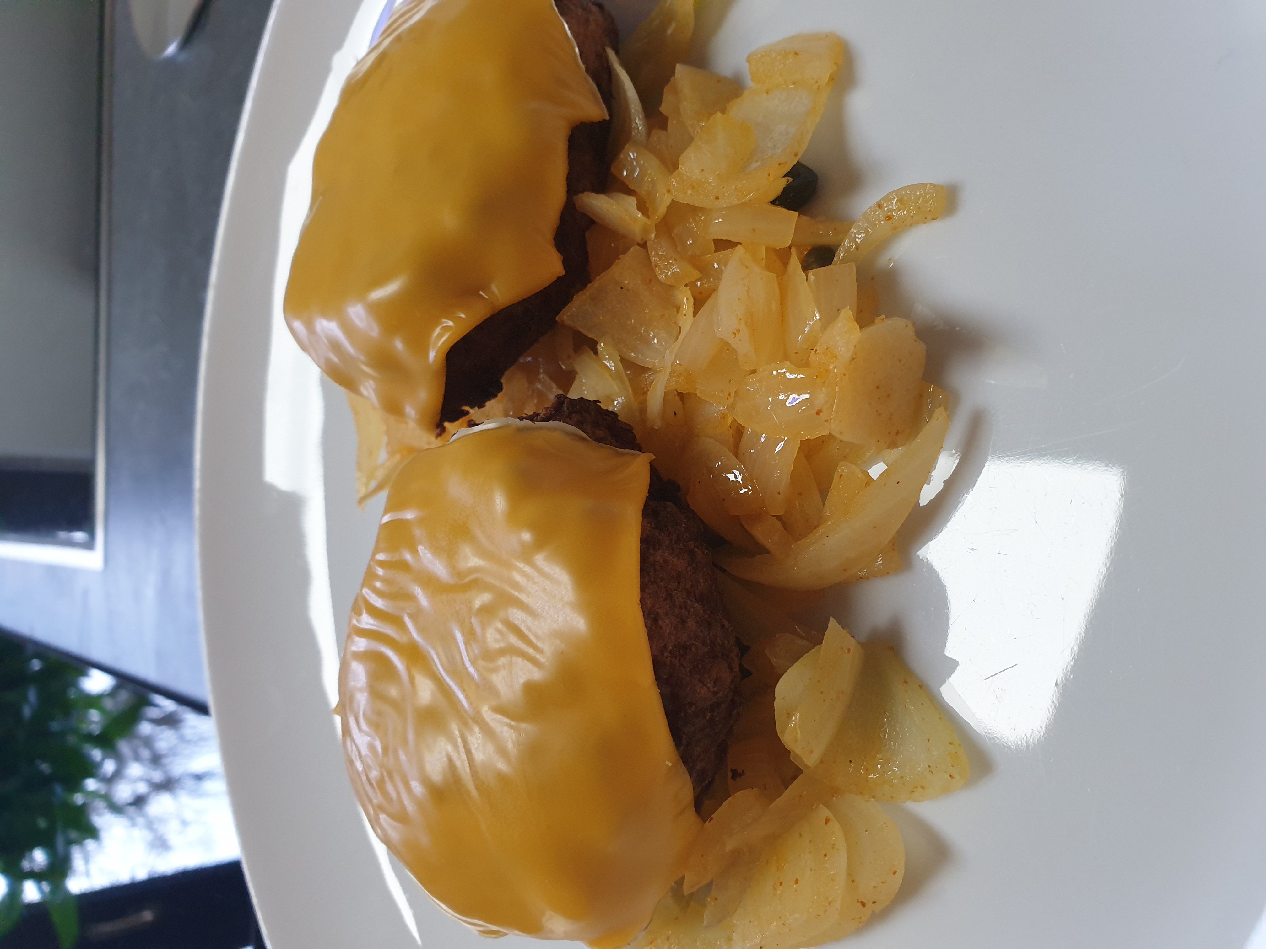 Fleischküchlein mit Cheddar auf Zwiebelbett