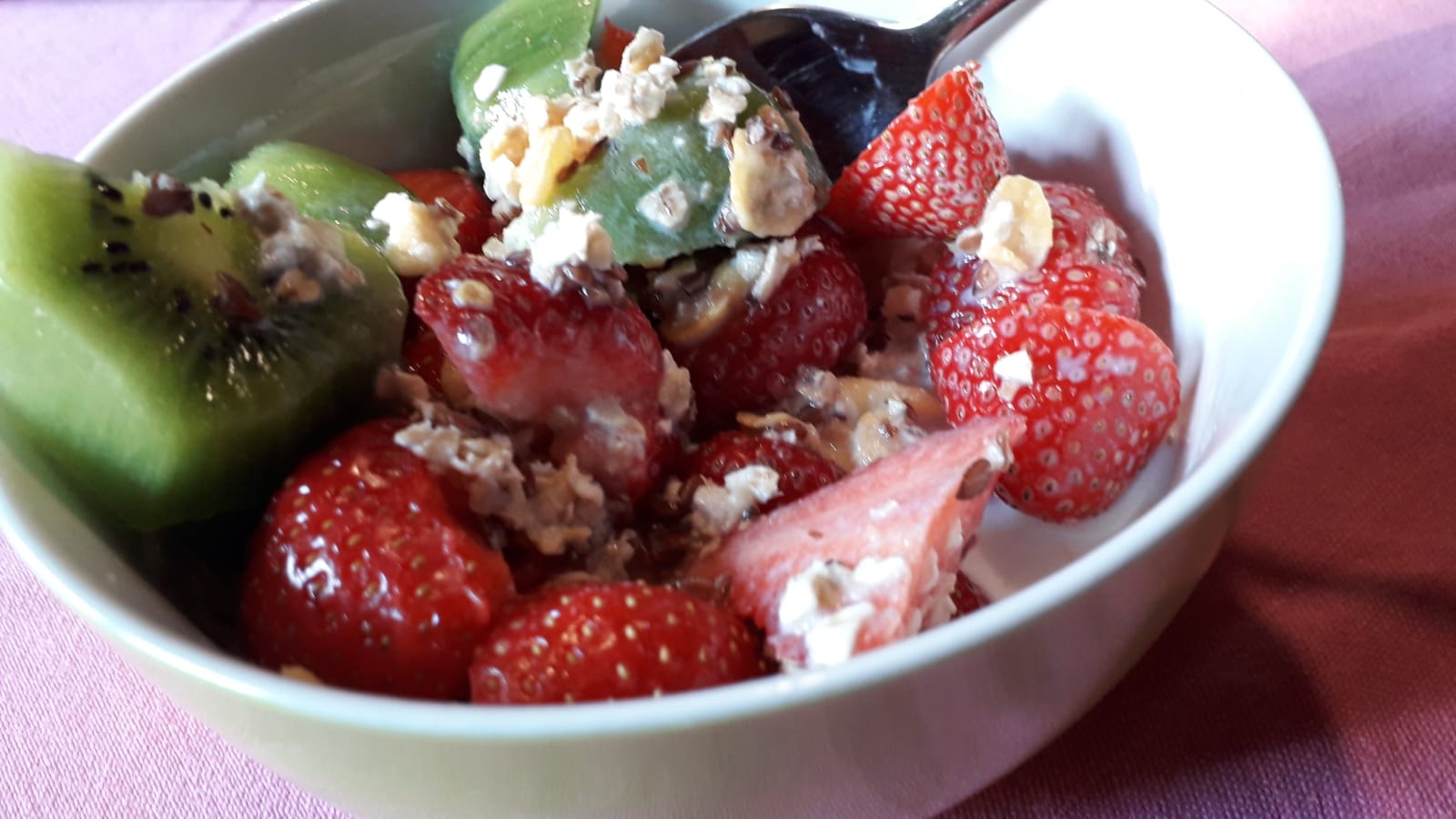Kiwi schälen und in kleine Stücke schneiden. Erdbeeren waschen, putzen und zerteilen. Obst vorsichtig unter die Haferflocken und Nut Flakes heben.