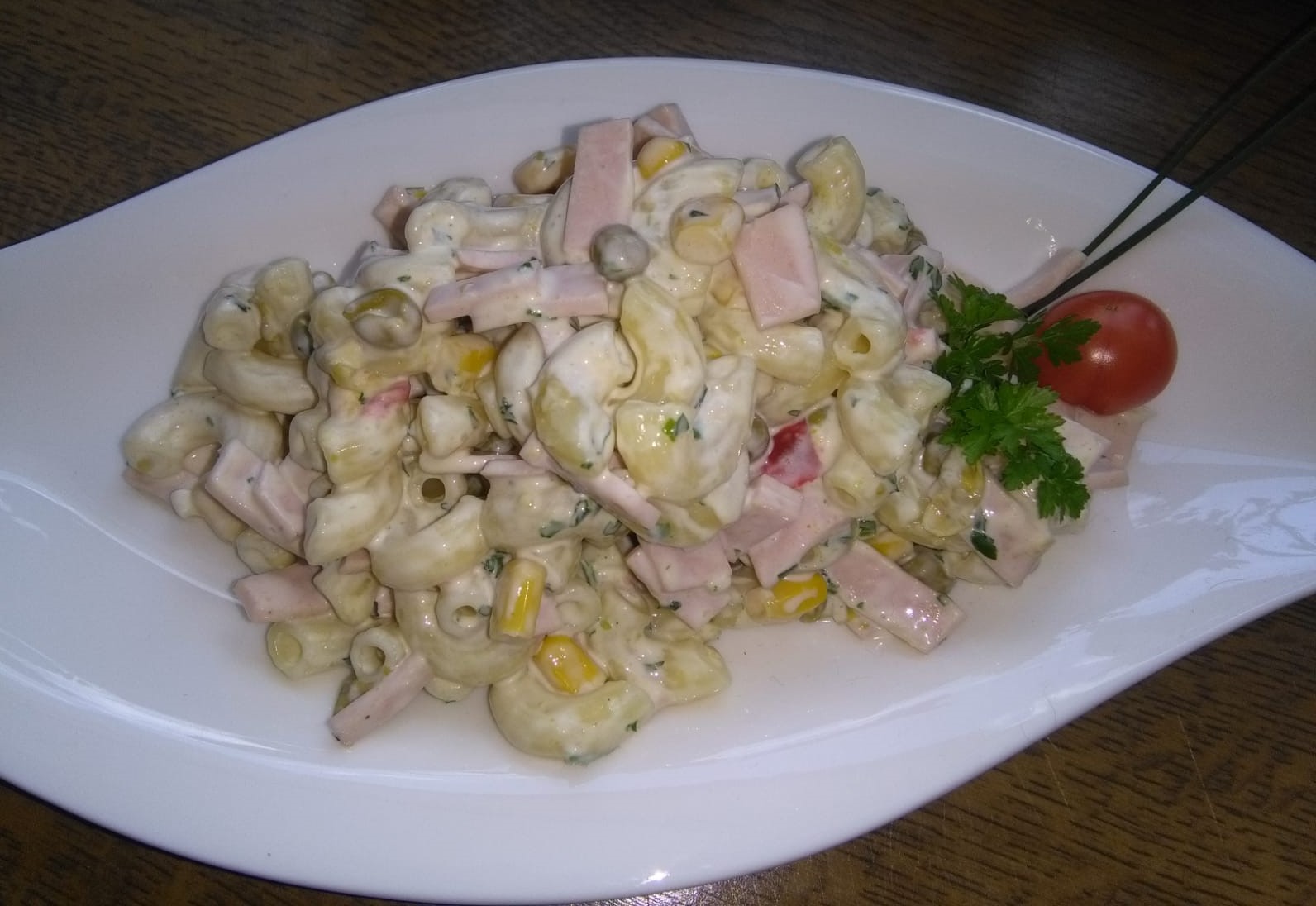 Ein deftiger Nudelsalat schmeckt immer und kann ganz schnell zubereitet werden.